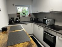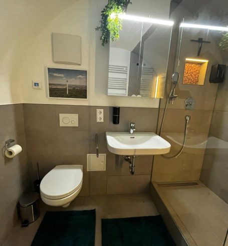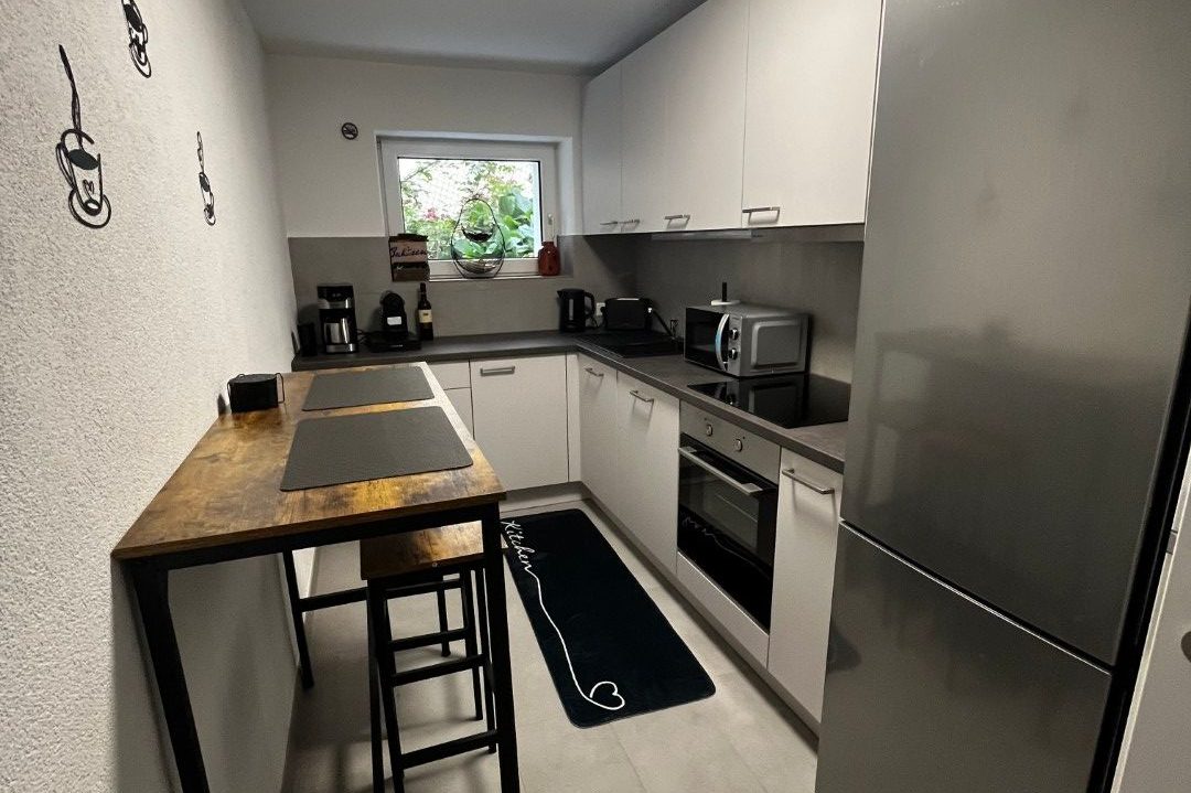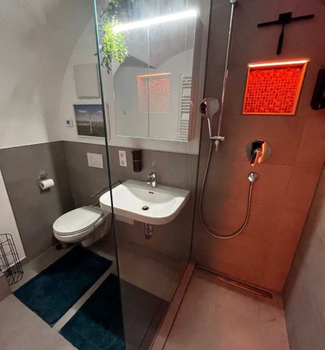 Die Ferienwohnung verfügt über eine moderne, voll ausgestattete Küche, die keine Wünsche offenlässt – ideal für kulinarische Entfaltung in gemütlicher Atmosphäre. Ein besonderes Highlight ist das stilvolle Badezimmer, das sich im ausgebauten Gewölbekeller befindet. Mit seinem einzigartigen Ambiente und der hochwertigen Ausstattung verbindet es historischen Charme mit zeitgemäßem Komfort.